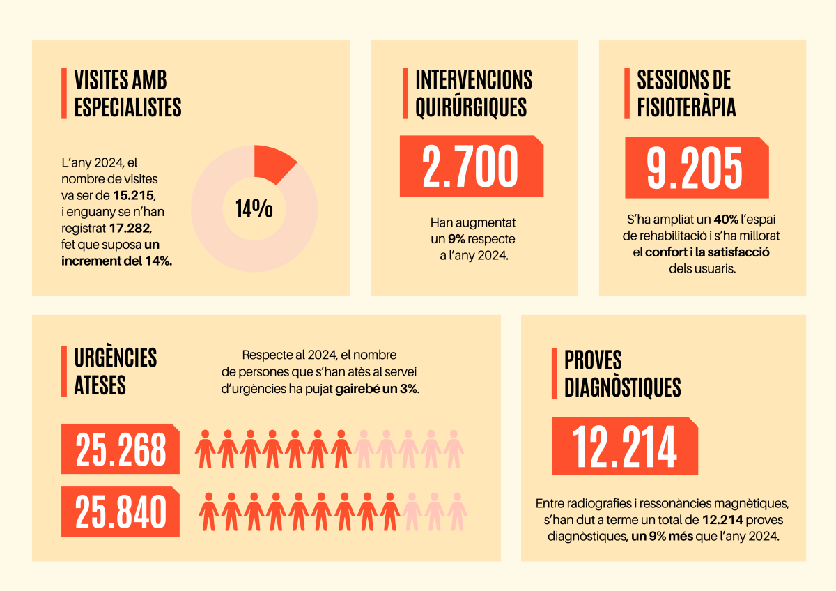 Pel que fa a les proves diagnòstiques (radiografies i ressonàncies), se n’han fet 12.214, un augment del 9%. El servei de rehabilitació també ha millorat les xifres situant-se en 9.205 sessions realitzades. Però, sens dubte, l’ascensió més significativa ha estat el de les visites amb els metges especialistes; s’ha passat de 15.215 l’any 2024 a 17.282 visites l’any 2025, una puja del 14%.