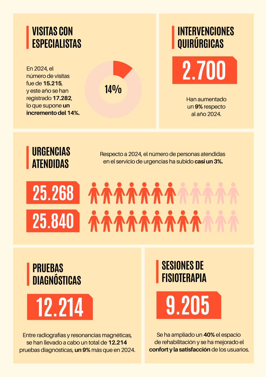 En cuanto a las pruebas diagnósticas (radiografías y resonancias), se han realizado 12.214, un aumento del 9%. El servicio de rehabilitación también ha mejorado las cifras situándose en 9.205 sesiones realizadas. Sin embargo, sin duda, la ascensión más significativa ha sido el de las visitas con los médicos especialistas; se ha pasado de 15.215 en 2024 a 17.282 visitas en 2025, una subida del 14%.